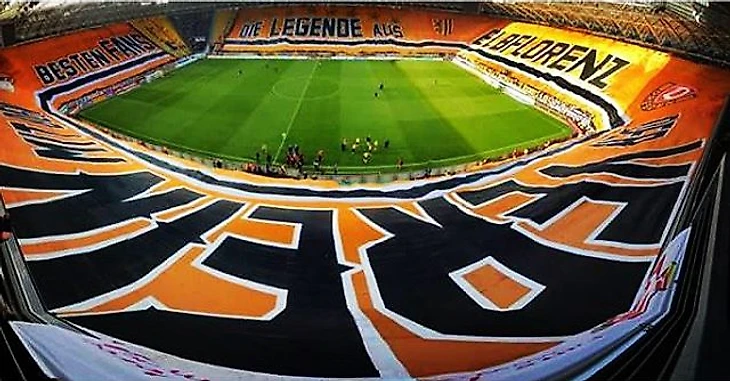 Этот гигантский перфоманс был организован на матче третьей немецкой лиги «Динамо» (Дрезден) – «Магдебург». Баннер длиной 350 метров полностью покрыл трибуны дрезденского стадиона перед выходом команд на поле.