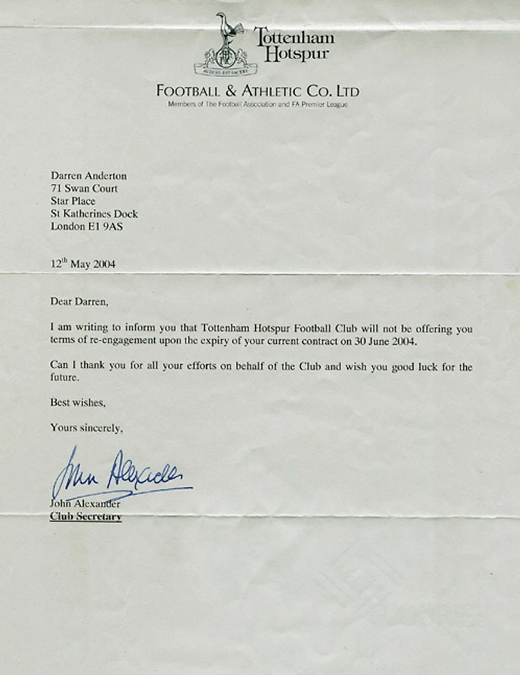 Я пишу, чтобы сообщить вам, что «Тоттенхэм» не будет предлагать вам переподписать контракт, истекающий 30 июня 2004 года.