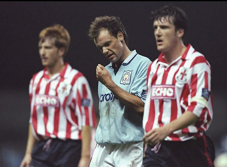 До этого, правда, Реслер не забивал четырнадцать матчей подряд – из-за летней травмы лодыжки и ухода своего напарника Пола Уолша. В итоге новый тренер «Сити» Алан Болл публично объяснил последнее место клуба тем, что Уве уже не тот, и перед следующей игрой с «МЮ» купил нового форварда – тоже грузина Михаила Кавелашвили, ставшего чемпионом России со «Спартаком-Аланией». «Не переживай, ты сыграешь с «МЮ». Ты все еще наш главный форвард», – заверил Реслера Болл за два дня до дерби. Приехав на стадион, Уве узнал, что остался в запасе. За пять минут до перерыва Кавелашвили забил после скидки Нила Куинна, Реслер разозлился еще сильнее, и через минуту после выхода на замену метко пробил с восемнадцати метров в дальний угол ворот Шмейхеля – 2:2. После этого Уве подбежал к скамейке «Сити», где сидел Болл, и показал на свою фамилию на майке. «У вас проблемы с тренером?» – «Да, серьезные проблемы, – не сдержался Реслер после матча. – Я не играю за него. Играю за клуб, партнеров, болельщиков, но не за Алана Болла».