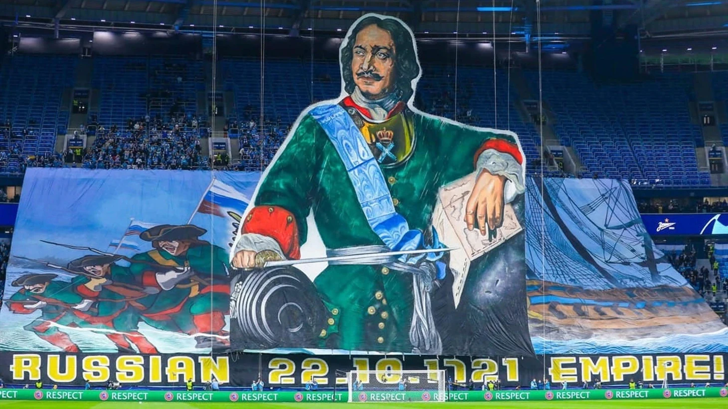 Думаю, перфоманс болельщиков «Зенита» точно не остался не замеченным. В начале матча на фанатском секторе появился баннер с изображением Петра I, солдат и надписью «Российская империя, 22.10.1721»
