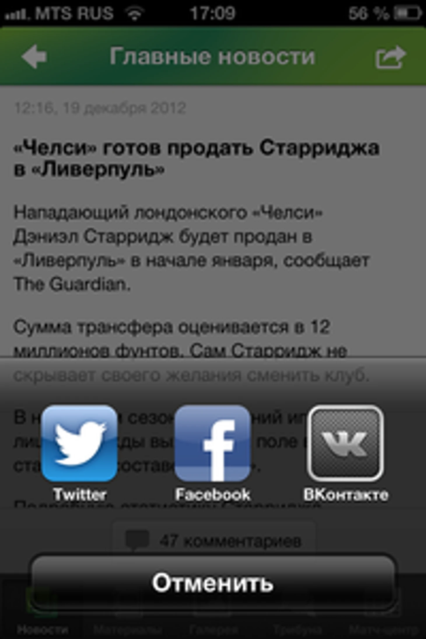 В новой версии приложения мы реализовали возможность расшарить любую новость, текст или запись в блоге в самых популярных социальных сетях – ВКонтакте, Facebook и Twitter.