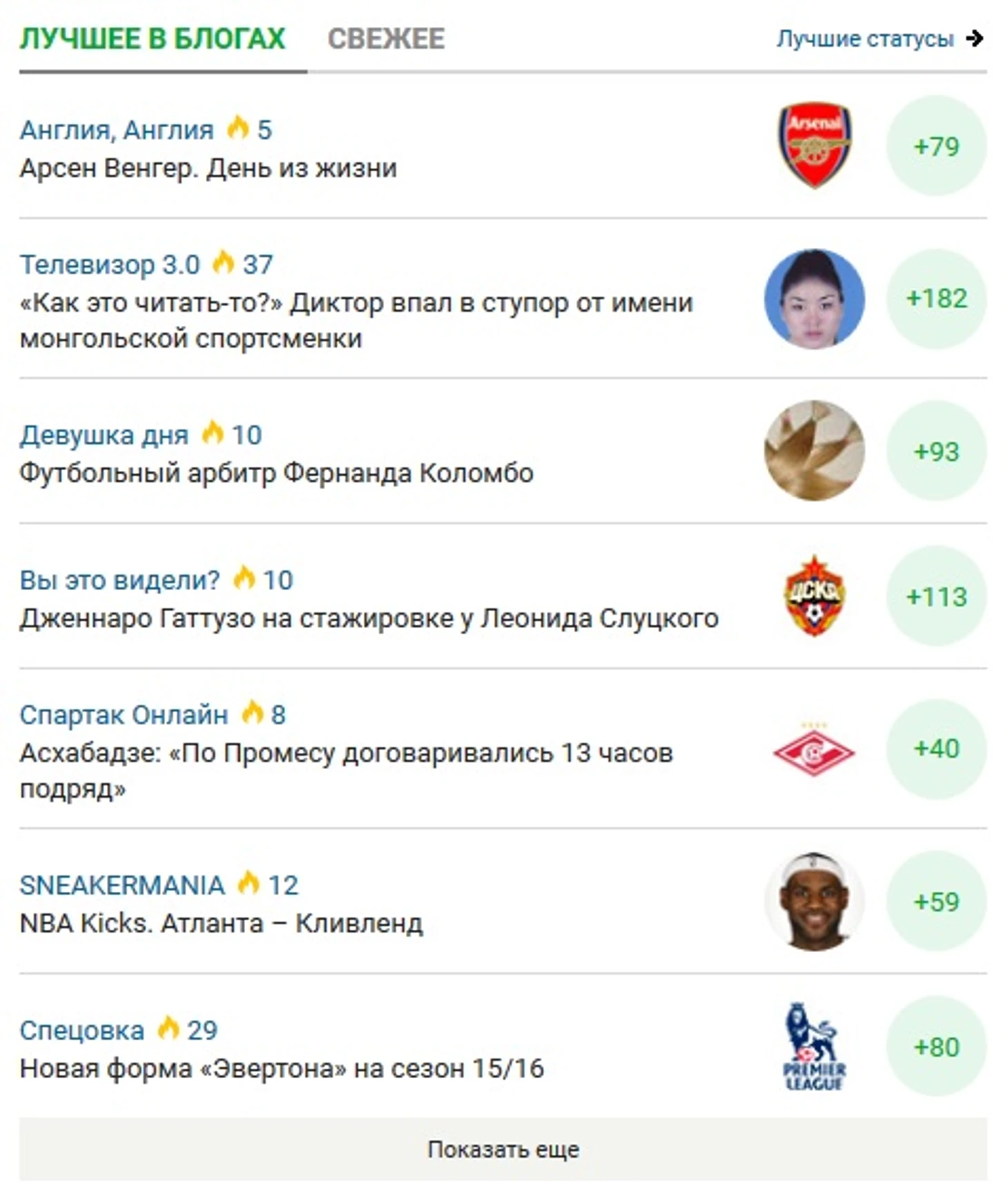 Если у вас нет времени или желания изучать блоги самостоятельно, доверьтесь мнению активных пользователей. По ссылке «Блоги» в меню – только лучшие свежие посты, набравшие достаточный рейтинг. Если вас интересует конкретный вид спорта (например, английский футбол), используйте выпадающее меню.