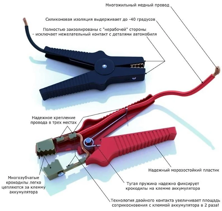 Еще одним важным параметром выбора устройств для прикуривания автомобиля является качество клещей («крокодилов»), которые крепятся к клеммам АКБ. Они должны выполнять следующие требования:
