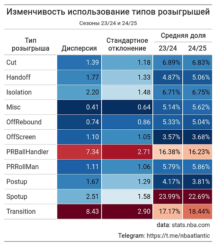 Давайте сначала посмотрим на типы розыгрышей в разрезе всей Лиги. Дисперсия и стандартное отклонение посчитаны на разнице в доле для типов у каждой команды. Из таблицы можно увидеть, что доля быстрых атак заметно выросла. Это интересно, потому что показатели темпа в этом сезоне нерекордные и, например, уступают прошлому сезону на том же временном отрезке. Если доля быстрых атак подросла на 1.3%, то спот-апы на столько же просели. Они остаются наиболее часто фиксируемым розыгрышем, но отрыв от второго места сократился с семи процентов до четырех.