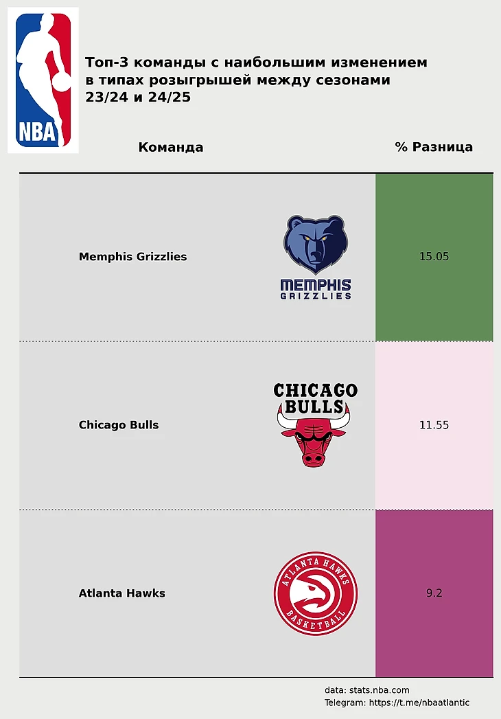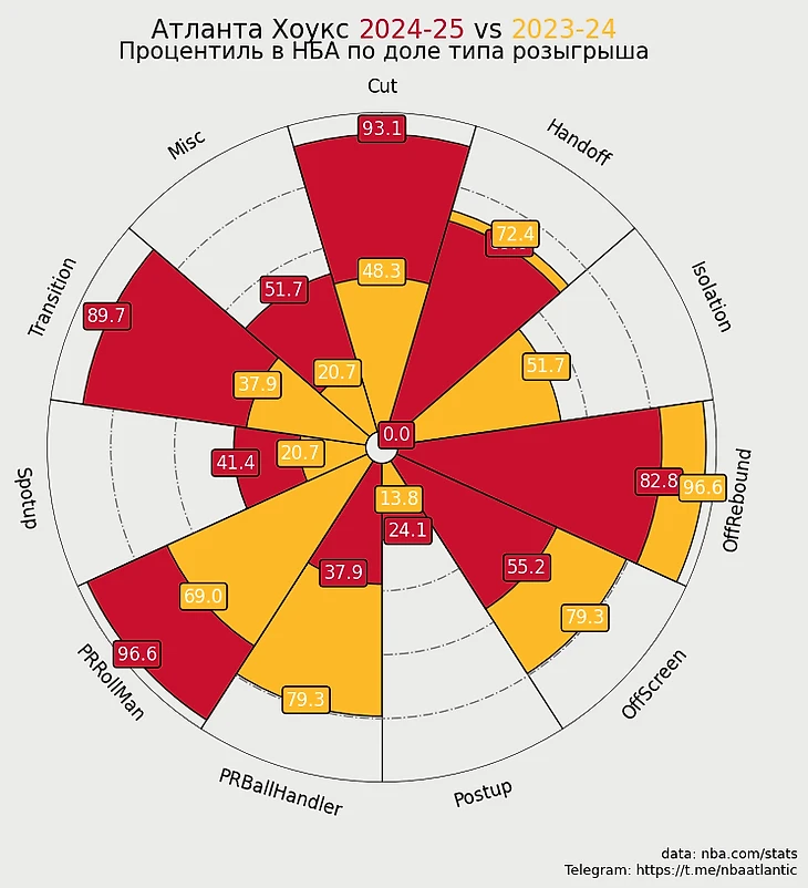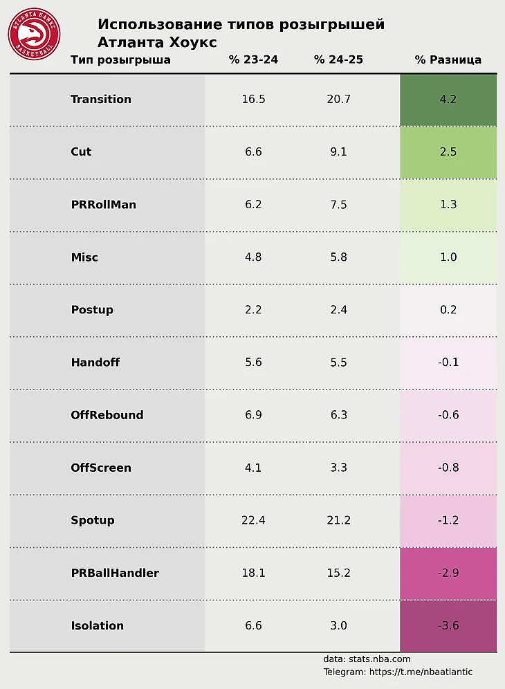 Атланта, в отличии от Мемфиса и Чикаго, не поляризует использование розыгрышей до поговорки «то густо, то пусто», по многим показателям она обитает в середине таблицы. Зато характер изменений похож на профиль Мемфиса, только цифры менее радикальные: рост быстрых атак и катов, падение PNR BH. Отличие в том, что у Хоукс очень сильно упала доля изоляций, более чем в два раза в сравнении с прошлым годом. Только пост-апы Атланта в этом сезоне играет реже чем ISO.