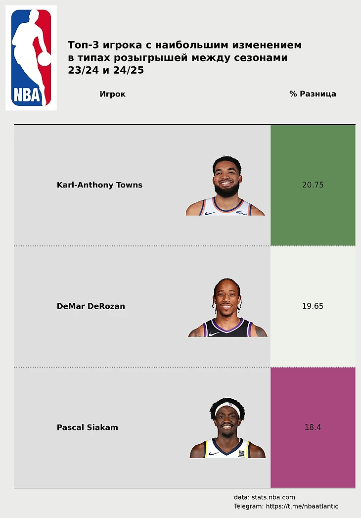 Для начала скажу, что я рассматривал только 12 игроков. Почему так мало? Из-за качества данных, Я подробно писал о проблеме в своем канале, здесь кратко скажу, что на вкладке Play Type для игроков представлены неполные данные, есть баскетболисты у которых «потеряны» больше половины розыгрышей. Но и среди этих двенадцати нашлись игроки с заметными изменениями, о которых стоит написать.