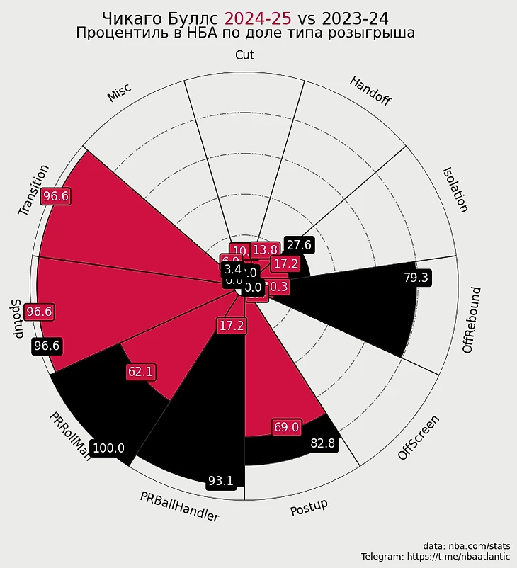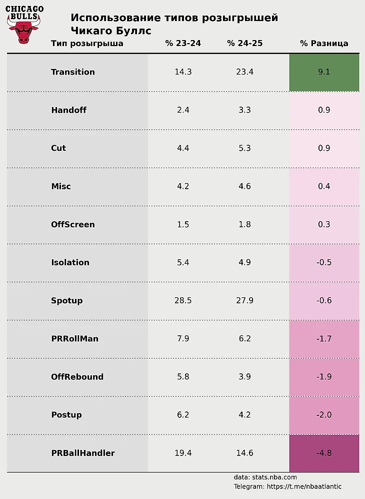 Про Чикаго можно сказать примерно тоже самое: быки стали гораздо «быстрее», и в Transition прыгнули с последнего места в прошлом сезоне на второе в этом, следом за Мемфисом. Кстати, посмотрите какая большая разница по доле использования Transition между первой и второй командой, Мемфис здесь просто в какой-то собственной лиге. В «проигравших» типах у Чикаго оба пик-н-ролла, и Postup (дальше, в секции про игроков, станет понятно почему). Как и с катами у Мемфиса, Postup у быков второстепенный тип с небольшим процентом использования, поэтому падение на 2% в абсолютных значениях это падение на треть относительно доли в прошлом сезоне.