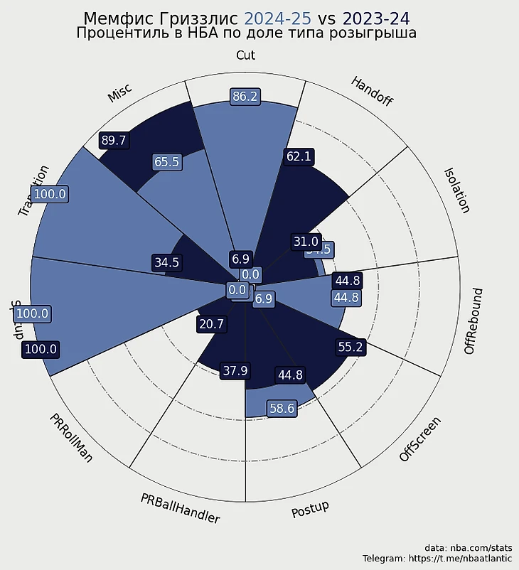 Немного расскажу о первом графике, т.н. Pizza chart. Идея, да и большая часть реализации, взята из прекрасной библиотеки для питона mplsoccer. Суть такая: 100-ый процентиль – это первое место по доле этого типа владения в лиге, 0-ой – это последнее. Шаг равен примерно 3.44%, так что 89.7 процентиль соответствует 4-ому месту в НБА.
