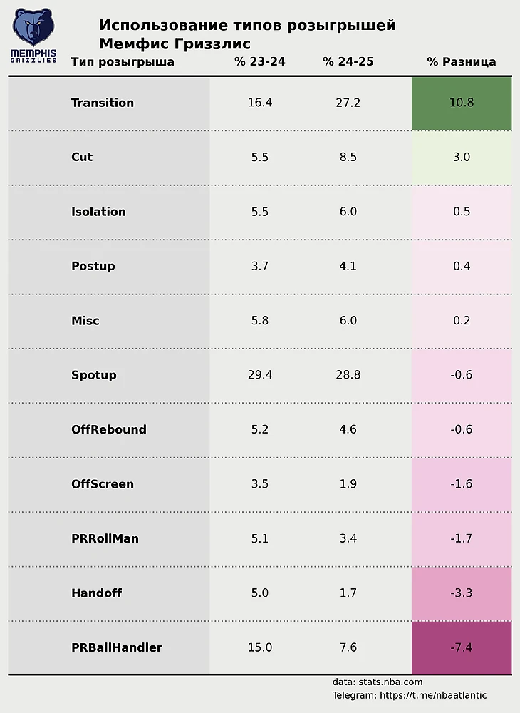 У Мемфиса главное изменение очевидно – Transition вырос пости на 11 проценов и мишки стали лидерами лиги в этом компоненте. На этом фоне меркнет изменение в катах, а на самом деле оно тоже заслуживает внимания. Каты в среднем используются гораздо реже пик-н-роллом или быстрых атак, поэтому изменение в 3 процента, это изменение на 60% и двадцать с лишним позиций в рейтинге команд НБА. Основной поставщик всех этих процентов – P&R BH. Если в прошлом году каждый 7 розыгрыш мишек был таким пик-н-роллом, то в этом только каждый тринадцатый. Можно сказать, что распределение долей у типов владений в Мемфисе очень неравномерно, по большинству типов они либо на вершине таблицы, либо в ее подвале