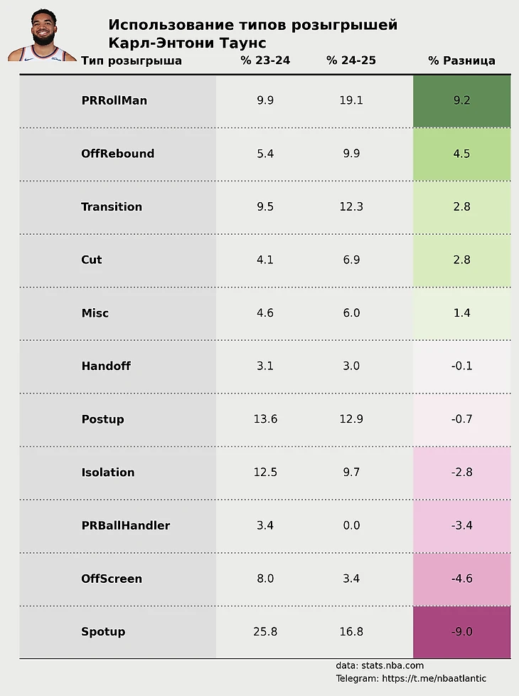 Таунс летом перешел в Никс к Тому Тибодо и его профиль поменялся очень заметно. Теперь КАТ, в плане розыгрышей, больше похож на центрового: в два раза выросла доля PNR RM, став его главным орудием. Также в два раза выросла доля подборов в нападении. Отдали свои проценты типы «получил-бросил», спот-ап и offscreen, которые чаще всего играются на трехочковой дуге. В прошлом году мы могли наблюдать пик-н-ролл КАТ-Гобер, где Таунс был за боллхэндлера. Теперь в Никс, когда Таунс сам играет роль Гобера (т.е. центра) их процент упал до нуля.