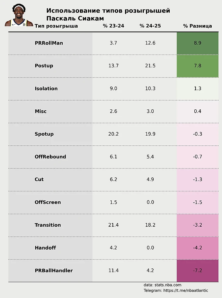 Изменения Сиакама нельзя объяснить только тем, что половину прошлого года он провел в Канаде. Возьмем два пик-н-ролла, которые находятся на разных полюсах таблицы. PNR BH в прошлом сезоне у Паскаля имеет стабильное 10.5% в обеих командах. PNR RM после перехода в Индиану заметно подрос, но это был рост с трех процентов до четырех с половиной, что заметно меньше разницы между сезонами. В этом году Паскаль в Индиане, судя по используемым типам, играет роль более классического большого, который ставит заслоны и продавливает соперника через пост.