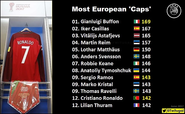 Криштиану Роналду близок к тому, чтобы войти в топ-10 игроков, которые провели наибольшее количество матчей в составе европейских сборных