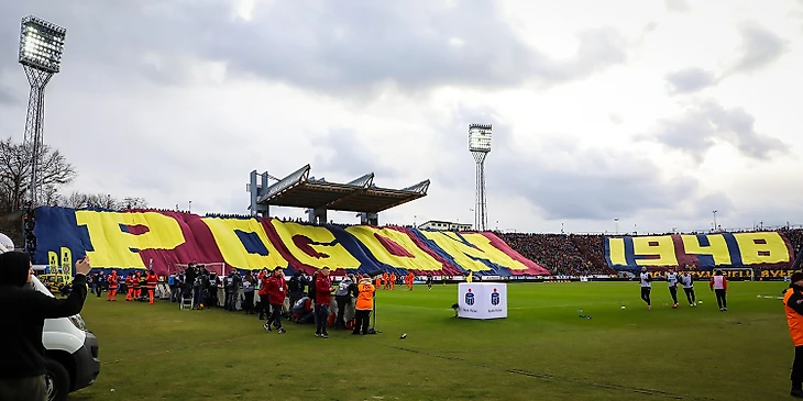 В середине первого тайма на центральной трибуне и части трибуны за воротами появились две секторувки: одна с названием команды, а вторая с годом основания клуба.
