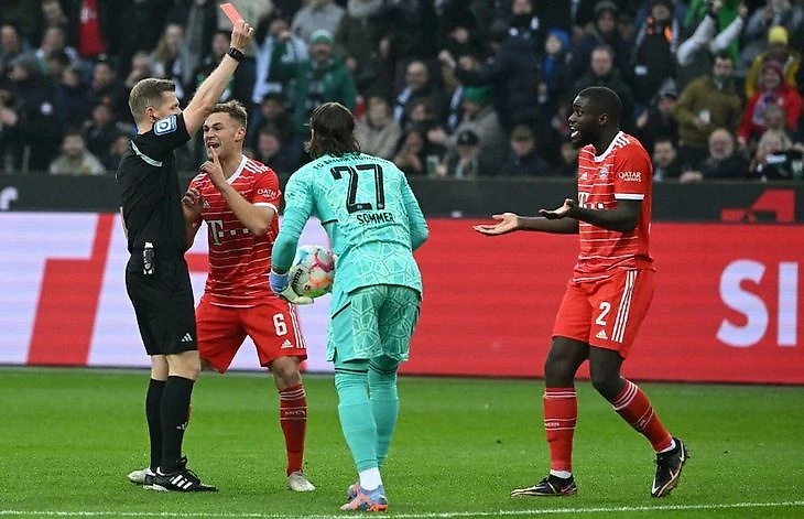 В последнем матче чемпионата Германии «Бавария» проиграла менхенгладбахской «Боруссии» в гостях. Счет матча 3:2. «Бавария» с 8 минуты играла в меньшинстве. Прямую красную карточку получил Дайо Упамекано. Он пропустит игру с «Унионом». В первом тайме команды обменялись голами. За «Баварию» забил Эрик Шупо-Мотинг. Во втором тайме мюнхенский клуб пропустил на 55 и 84 минуте. Итоговый счет установил Матис Тель. Он забил на третьей компенсированной минуте. Две голевые передачи на счету Альфонсо Дэвиса.