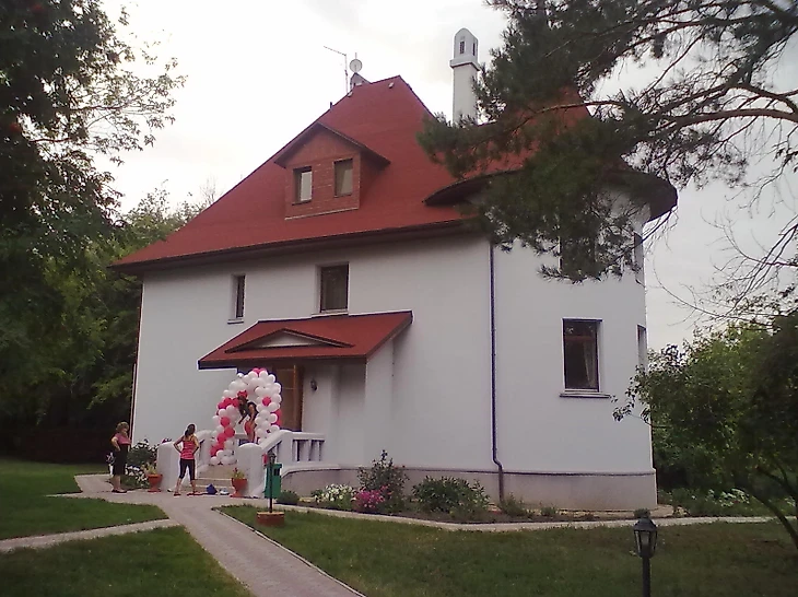 Архитектурное сооружение белого цвета с красной крышей видно издалека благодаря тому, что находится на возвышенности. В годы Великой Отечественной войны в нем размещался госпиталь для раненых солдат. Затем в нем располагался один из спальных корпусов дома отдыха «Просвещенец». Сейчас это гостевой дом «Замок» базы отдыха «Ривьера». Находится он на улице Российской Республики.