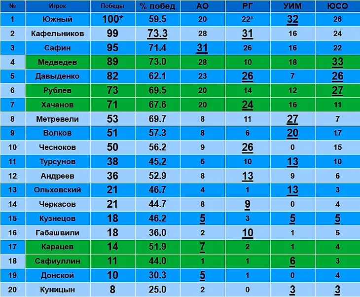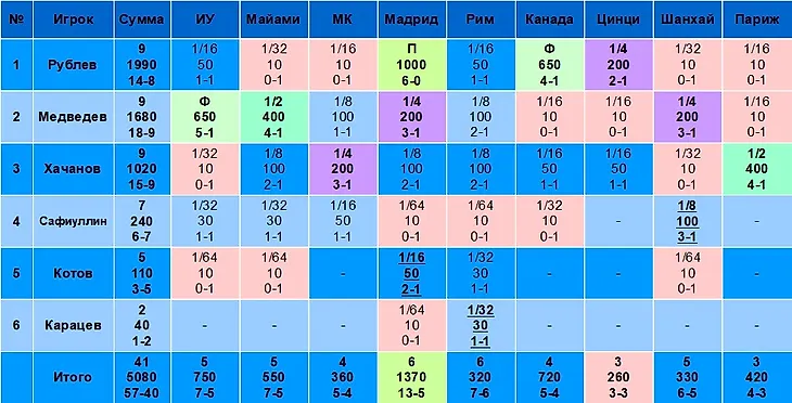 Сколько очков набрали российские теннисисты на Шлемах за всю карьеру