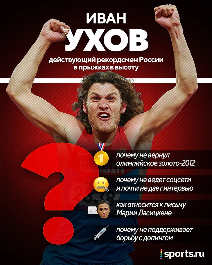 • 31 января 2019 года Ухов показал лучший результат сезона в мире. Наутро он узнал, что дисквалифицирован на 4 года по показаниям Родченкова, а олимпийская победа в Лондоне – аннулирована. Срок отстранения в суде сократился до 2 лет 9 месяцев, но в сектор Ухов уже не вернулся.