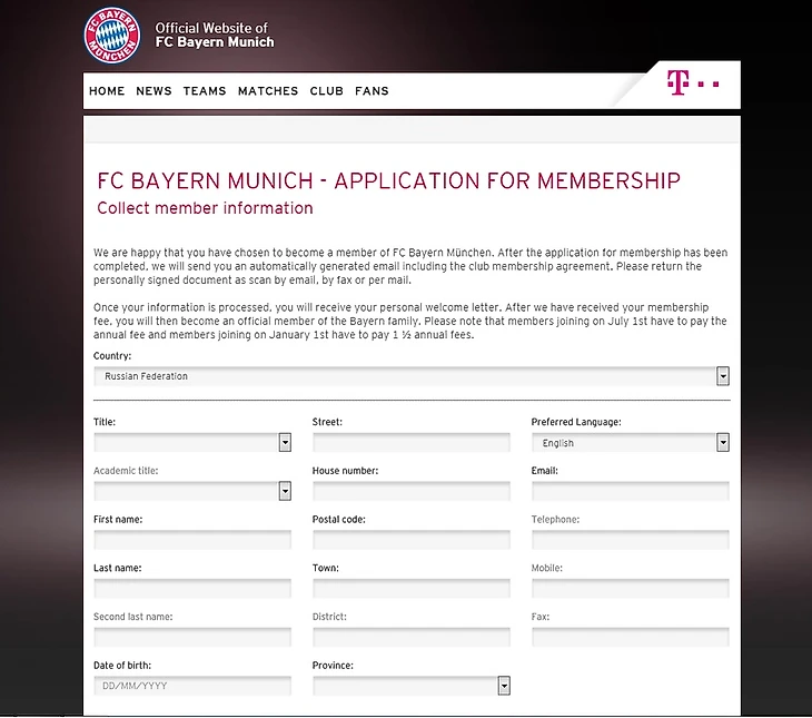 Сперва вы должны зарегистрироваться на сайте «Баварии», если ранее этого не сделали. Это можно сделать здесь - https://online.fcbayern.com/registration/registration.xhtml#/?programmid=0001&fields=1&service=https:%2F%2Ffcbayern.com%2Fen%2Fsso-security-check%3Ftarget%3DL2Vu. Процедура не сложнее, чем при регистрации на любых других сайтах. После успешной активации вашей учетной записи, мы переходим непосредственно к становлению официальным болельщиком или Mitglieder. Для этого заполните вот эту форму - https://mitglieder.fcbayern.de/mitglied-werden/?lang=en. В ней также нет ничего сложного. Не стесняйтесь пользоваться переводчиком в случае необходимости.