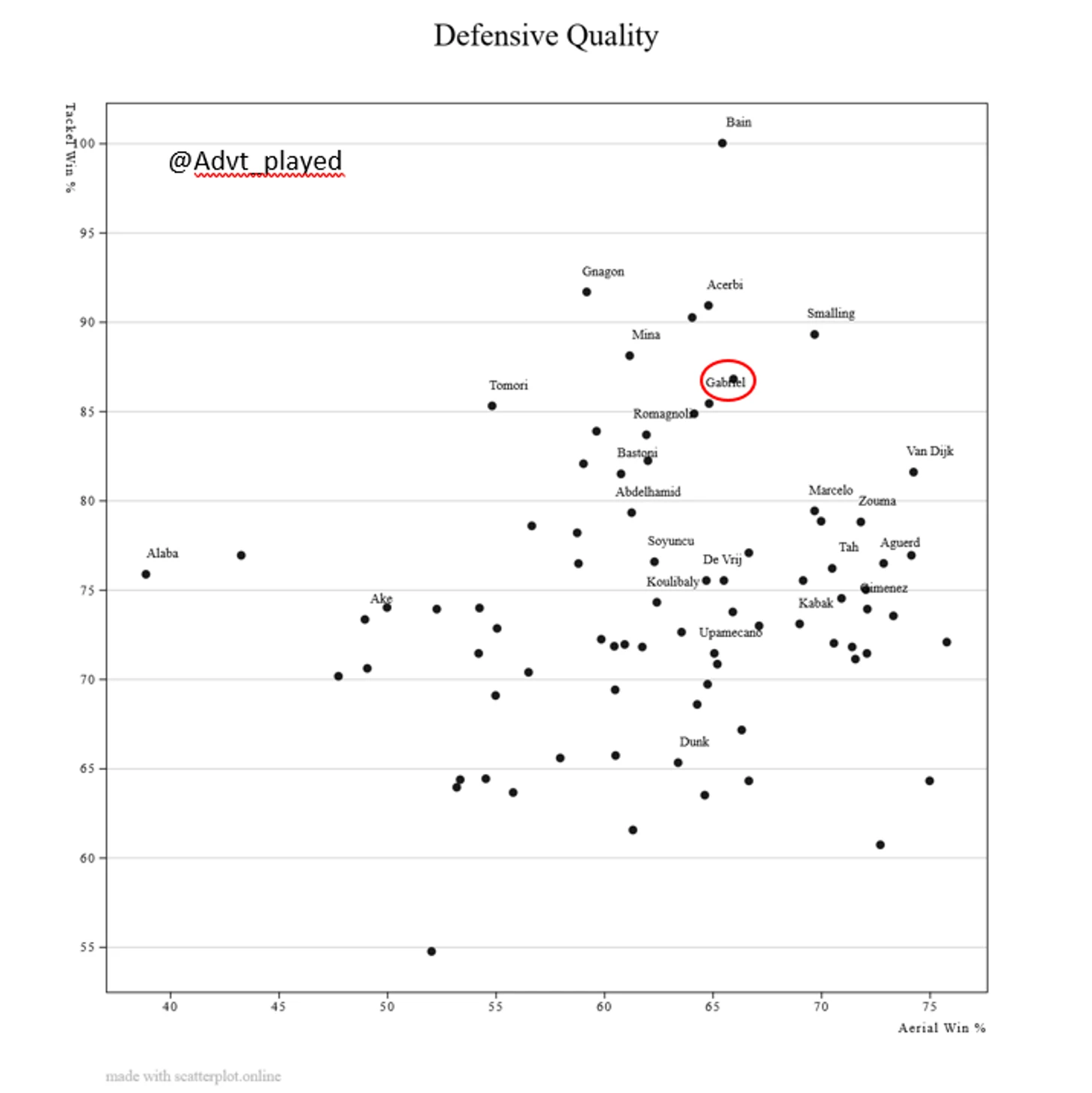 Это самое очевидное сильное качество Габриэла в обороне. За счет чтения игры, концентрации и выбора позиции, а также склонности всегда играть проактивно, Габриэл постоянно выдергивается из обороны, поджимая игрока между линий. Стартовая скорость Габриэла также важна - он неплохо разгоняется и часто оказывается первым на мяче.
