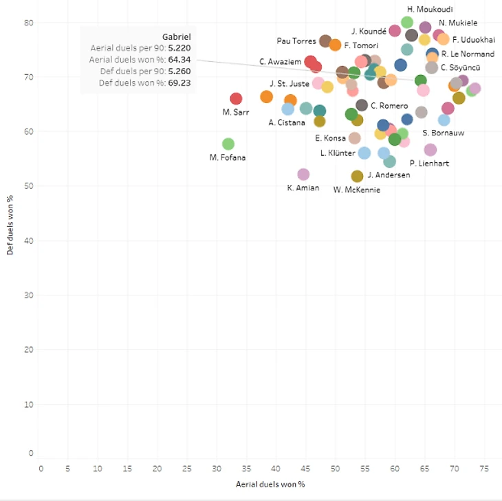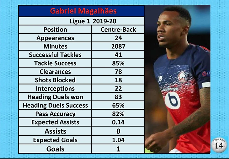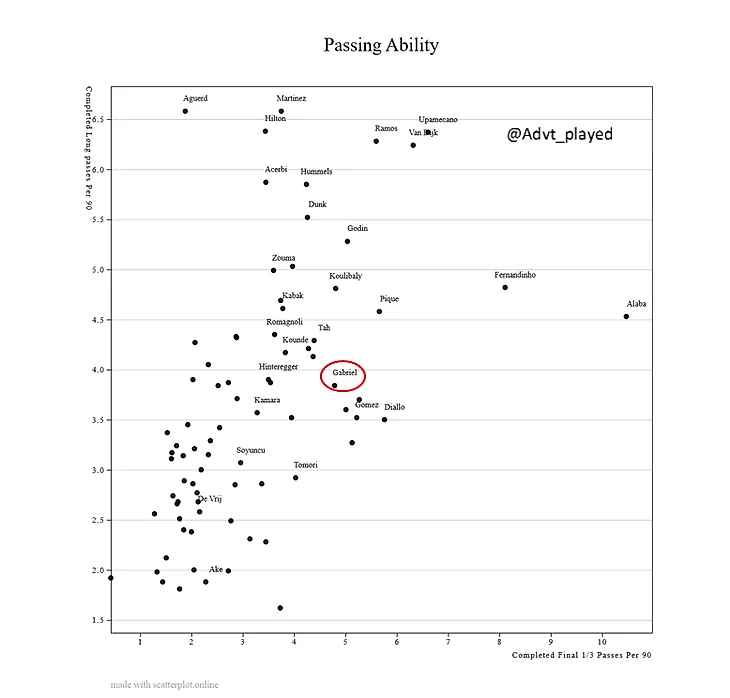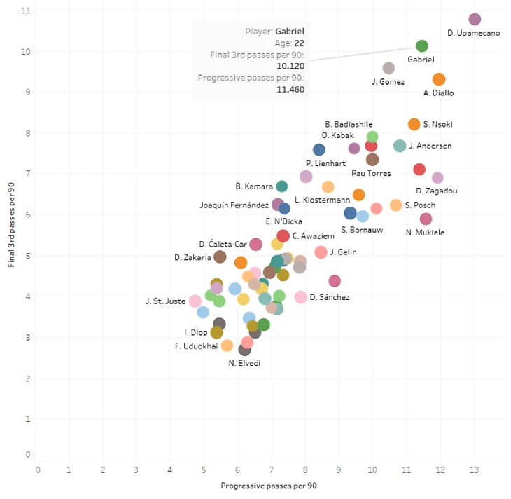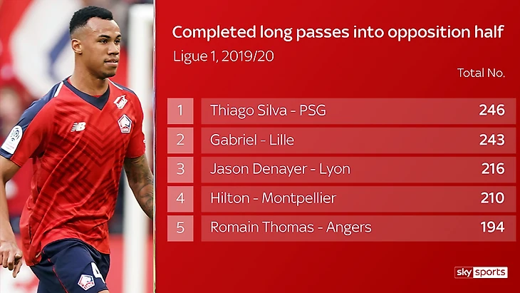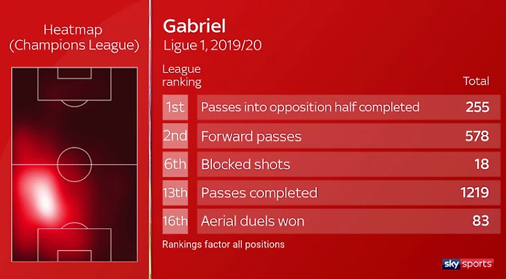 Согласно FBref.com ни один игрок Лиги 1 в этом сезоне не сделал больше передач в финальную треть, чем Габриэл со своими 111 пасами. По количеству средних передач (5-25 метров) он тоже в числе лидеров среди центрбеков – 903 передачи с точностью 92%.