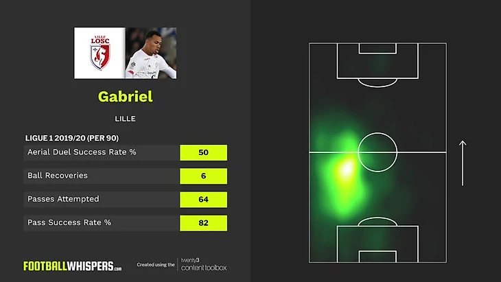 В паре со своим опытным партнером Фонте Габриэлу явно дано задание быть более агрессивным игроком, а его скорость компенсирует недостатки Жозе. «Лилль» занимает 12-е место в Лиге 1 по допущенному xG, но третье по созданному xG, атака «Лилля» превалирует над обороной, но созидание это еще одна область игры, в которую вовлечен бразилец.