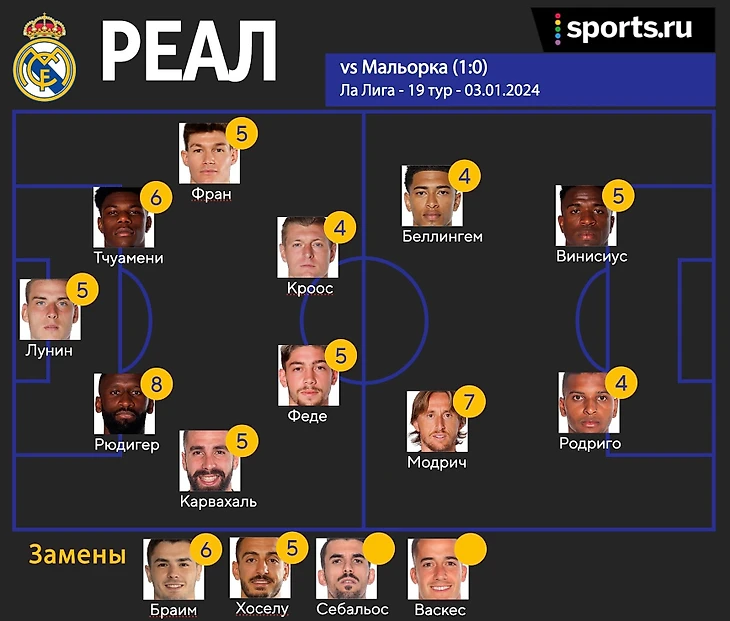 Браим Диас — 6. Браим неплохо вошел в матч, но эпизод со штангой – это дикость. Хорошо, что не это стоило очков. Да, это был не самый легкий мяч в вопросе траектории и стеба Браим за этот промах точно не заслужил, но такое надо заносить в сетку. И меня терзают смутные сомнения, что этот эпизод так детально бы «разбирали», окажись на месте испанца Вини, Хоселу или Родриго, от которых порой требуют 100% реализации даже полумоментов. В остальном, как сказал Анчелотти, Диас придал команде свежести во втором тайме. У меня большие надежды на Браима в матчах Кубка: там явно будет ротация и кто-то должен повести за собой второй состав. Думаю, Браиму это под силам.