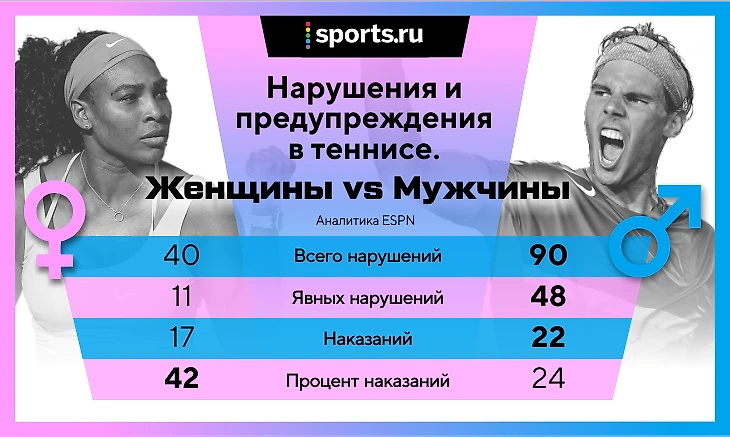 • Кроме того, канал выявил, что судьи вынесли мужчинам три устных, неофициальных предупреждения, а женщинам – ни одного. Многие критиковали Рамоса как раз за то, что он не попытался остудить Серену таким приемом.