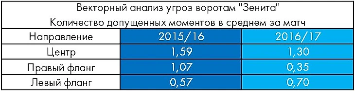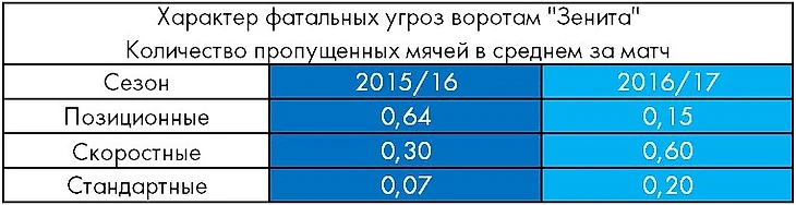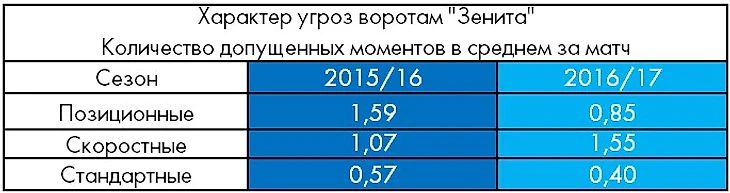 1. Помимо количества допущенных моментов при позиционных атаках соперника, снизилось и их качество – с 40% в сезоне 2015/16 до 18% в сезоне нынешнем. Как следствие, после позиционных атак соперника зенитовцы в этом сезоне пропустили лишь трижды, причем все три мяча – в обоих проигранных матчах.