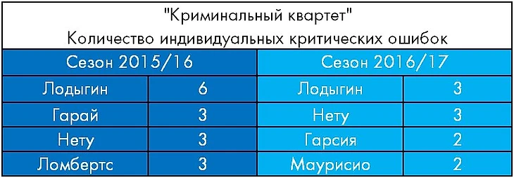 Вполне очевидно, что процент реализации моментов, которым сопутствовали оплошности криминального характера, в среднем значительно выше нормы. В этом сезоне к пропущенным мячам привели 7 критических ошибок из 14 (50%), а в сезоне 2015/16 – 13 из 24 (54%). При этом процент реализации моментов, напрямую с такими ошибками не связанных, составляет 29% и 25% соответственно.