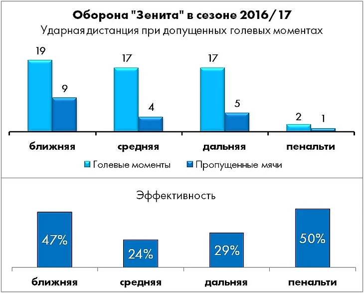 По сравнению с прошлым сезоном, когда доля голевых моментов с ударами с близкого расстояния составляла 44%, со средней – 36%, а с дальней – только 18%, после прихода Луческу дистанционное распределение угроз воротам «Зенита» существенно изменилось.