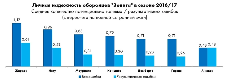 В нынешнем сезоне на совести зенитовцев числится 14 ошибок особой степени тяжести (0,70 в среднем за матч), тогда как по итогам сезона прошлого таковых накопилось 24 (0,55). Таким образом, динамика роста «критической массы» погрешностей составила порядка 30%.