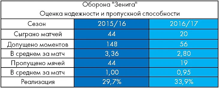Но прежде, чем переходить к описанию и диагностике основных неисправностей в механизмах защиты и выявлению наименее надежных элементов каркаса, предлагаю взглянуть на сравнительную картину обороноспособности «Зенита» в прошлом и текущем сезонах.