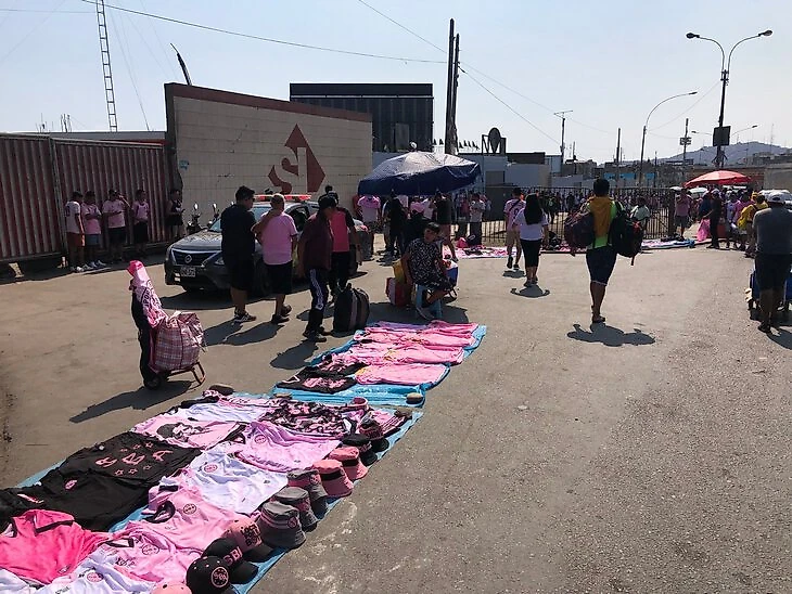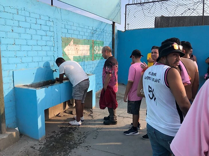 В ожидании игры жара становится главной заботой. Матч начинался в 16 часов. В это время года в Лиме очень жаркая погода. А на стадионе нет крыши, поэтому люди предпочитают прятаться в тени под стеной стадиона, прежде чем проходить внутрь. А те, кто уже оказался внутри, умываются в одной из двух раковин, установленных на стадионе. В перерыве тут будет очередь длиннее, чем в туалет.