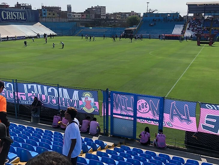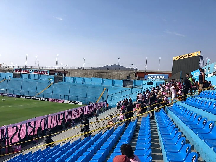 Внутри обычно центральная трибуна разделена лентой на три части: в центре имеются сиденья, сюда билет стоил 25 солей (примерно 500 рублей), а по краям сидений нет, только бетонный пол. Билеты в эти сектора стоили по 12,50 солей (примерно 250 рублей).