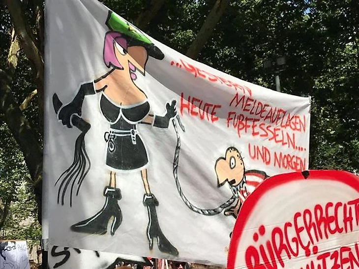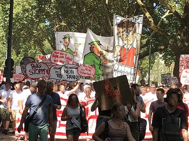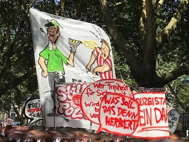 Помимо фэнов на митинге были представители профсоюзов, юристы, оппозиционеры, антифашисты и даже защитники окружающей среды. Некоторые из множества баннеров ссылались на уроки прошлого Германии, а точнее на 1933 год, когда под крылом нацистов было сформировано гестапо (политическая полиция Третьего рейха). И немцы утверждают, что когда государство получает полный контроль над своими гражданами, всё заканчивается печально для всех и такое никогда не должно повториться.