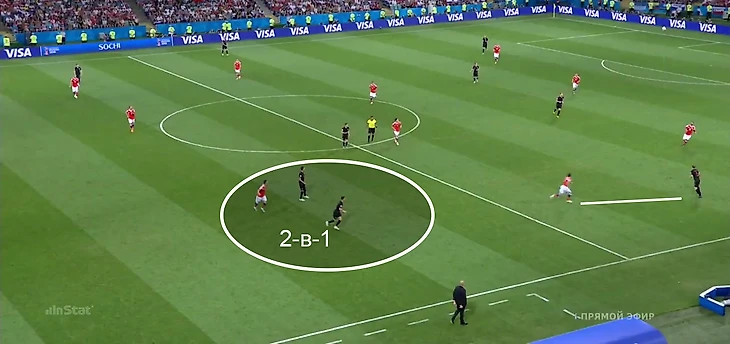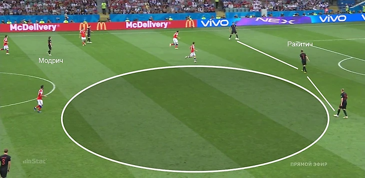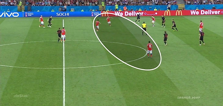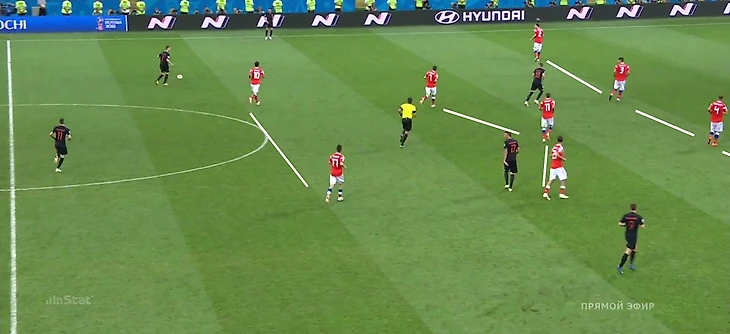 В таких условиях высокий прессинг был очень логичным ходом. Вместе с эффектом неожиданности он позволил России тактически доминировать в первом тайме. «Россия провела очень хороший матч, особенно первый тайм. Они нас удивили. Они прессинговали очень высоко и не давали нам строить атаки от вратаря в короткий пас, – пояснял Модрич. – Мы же предпочитали дальние передачи рискованным пасам, которые могли бы дать нам преимущество».