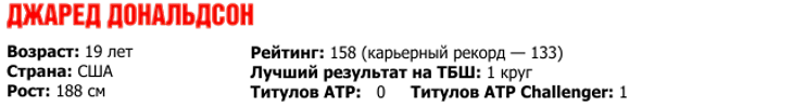 «В туре много хороших молодых игроков, но я не смотрю на них как на своих соперников. Для меня соперники – это Джокович, Федерер, Надаль и Маррей. К этому уровню нужно стремиться». Слова Джареда Дональдсона могут показаться немного наглыми, но в таком юном возрасте нет ничего плохого в амбициозности. В особенности если она подтверждается результатами.
