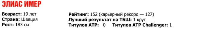 В Швеции, давшей теннису множество выдающихся талантов, в последние годы не появлялось игроков, которые могли бы претендовать на большие победы. Элиас Имер, в свои 19 лет уже ставший первой ракеткой страны, может стать первым после Содерлинга успешным шведским теннисистом. В 2015 году Имер стал всего лишь вторым игроком в Открытой эре, сумевшим пройти за сезон квалификационные турниры на всех четырех турнирах «Большого шлема». Пока самым успешным для Элиаса остается турнир в Барселоне, где он смог добраться до третьего круга, обыграв де Баккера и Киргиоса.