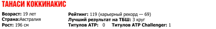Имя молодого австралийца на слуху уже не первый год и не просто так. Танаси уже успел побывать в Топ-70 рейтинга, доходил до третьего круга на «Ролан Гаррос» (проиграл Джоковичу), а также до четвертого круга в Индиан-Уэллсе. Коккинакис отлично подает, мощно играет и справа, и слева, не срывается после проигранных геймов и сетов (достаточно вспомнить как он отыгрался со счета 0:2 по сетам в матче с чехами на Кубке Дэвиса).