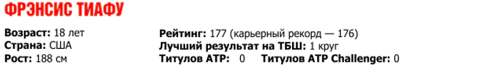 Тиафу – еще один многообещающий американец, которого, по слухам, взяла под крыло менеджерская компания Роджера Федерера Team8. Фрэнсис уже в 15 лет смог выиграть один из самых престижных юниорских турниров Orange Bowl в категории до 18, став самым молодым чемпионом в истории этих соревнований.