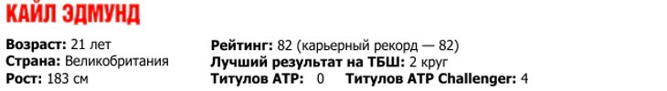 Кайл Эдмунд – тот самый парень, которому в конце прошлого года сочувствовали все, когда он в первом в жизни матче на Кубке Дэвиса уступил Давиду Гоффену, ведя 2:0 по сетам и отдав на корте все, что только смог. Эдмунд пришел в теннис довольно поздно – в 10 лет, после увлечения плаванием и крикетом. Однако он быстро смог стать одним из лучших юниоров планеты и дважды праздновал победы на юниорских турнирах «Большого шлема» в паре.