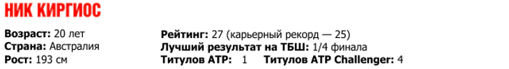 При этом Киргиос знаменит не столько своими теннисными достижениями, сколько агрессивным и иногда переходящим все рамки приличия поведением на корте. Штрафы, предупреждения и даже угроза дисквалификации – в свои 20 лет австралиец, как говорится, попробовал все. Ник человек настроения, если он хочет играть, то его мало что может остановить, но если он встал не с той ноги, то происходящее на корте его совершенно не волнует. Кроме того, для своего возраста он слишком часто страдает из-за травм, которые иногда не позволяют ему играть в полную силу. Если Киргиосу удастся стать боле дисциплинированным и спокойным на корте, то попадание в Топ-10 для него – вопрос ближайшего времени.