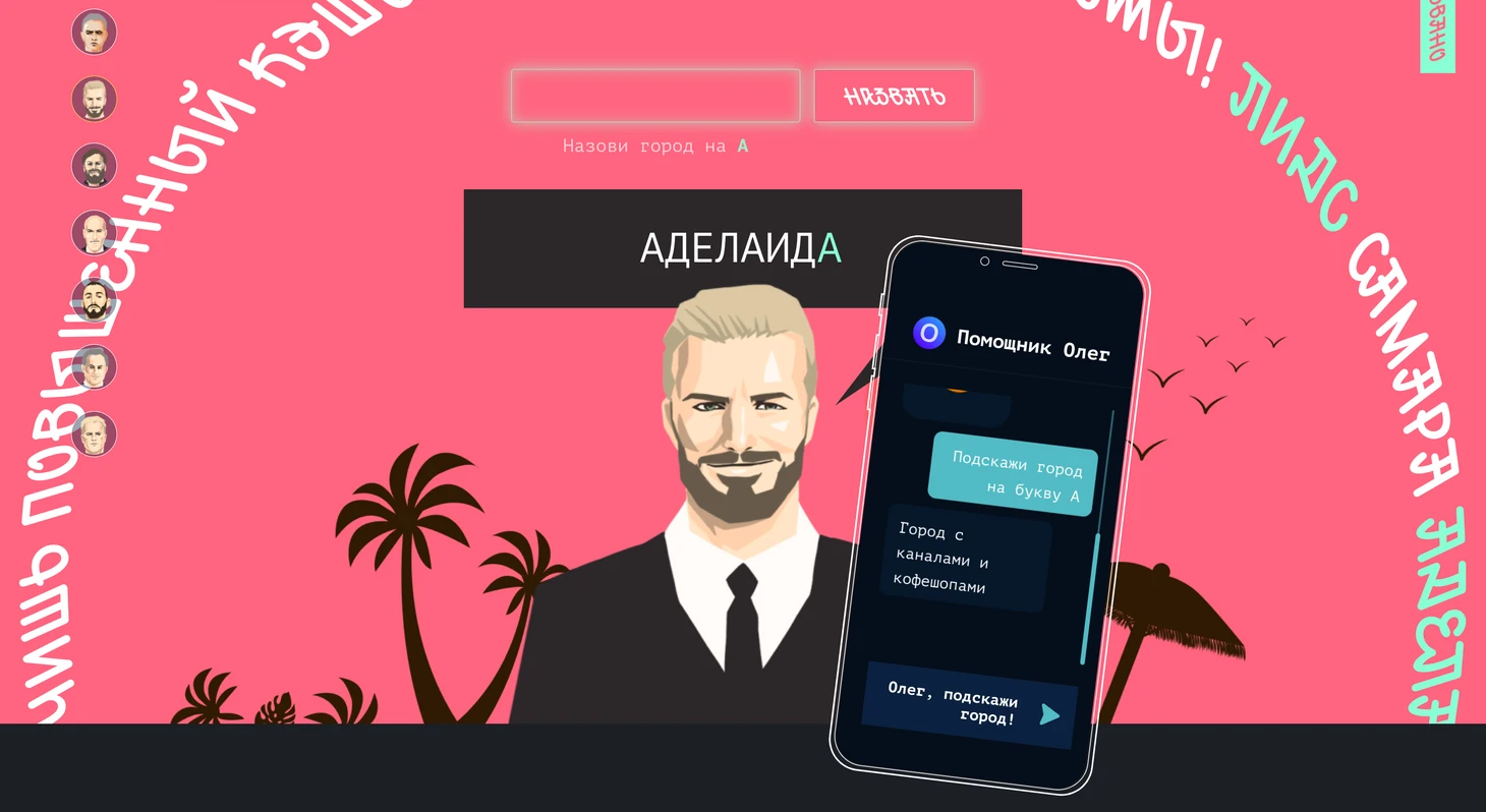 Летом 2021 году мы подготовили спецпроект с «Тинькофф Банком». В нем пользователи играли в города с известными личностями из мира футбола, среди которых Юрген Клопп, Жозе Моуриньо, Дэвид Бекхэм, Криштиану Роналду и даже Виталий Мутко. Каждый из персонажей использовал свою тактику, когда называл город: Клопп как любитель футбола в стиле хард-рок упоминал только те, где проходят рок-фестивали, а модник Дэвид Бекхэм – те, где проходят показы мод.