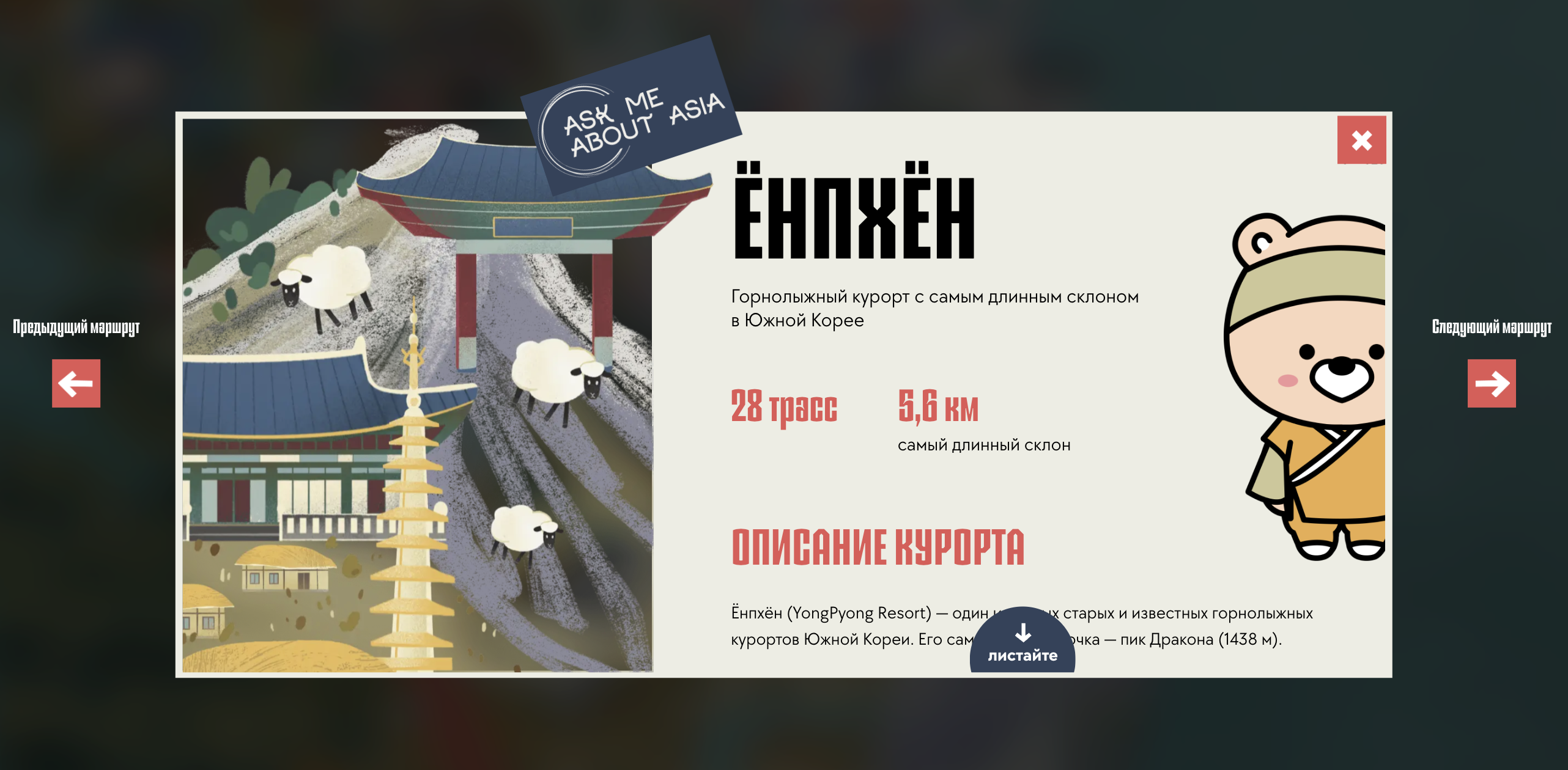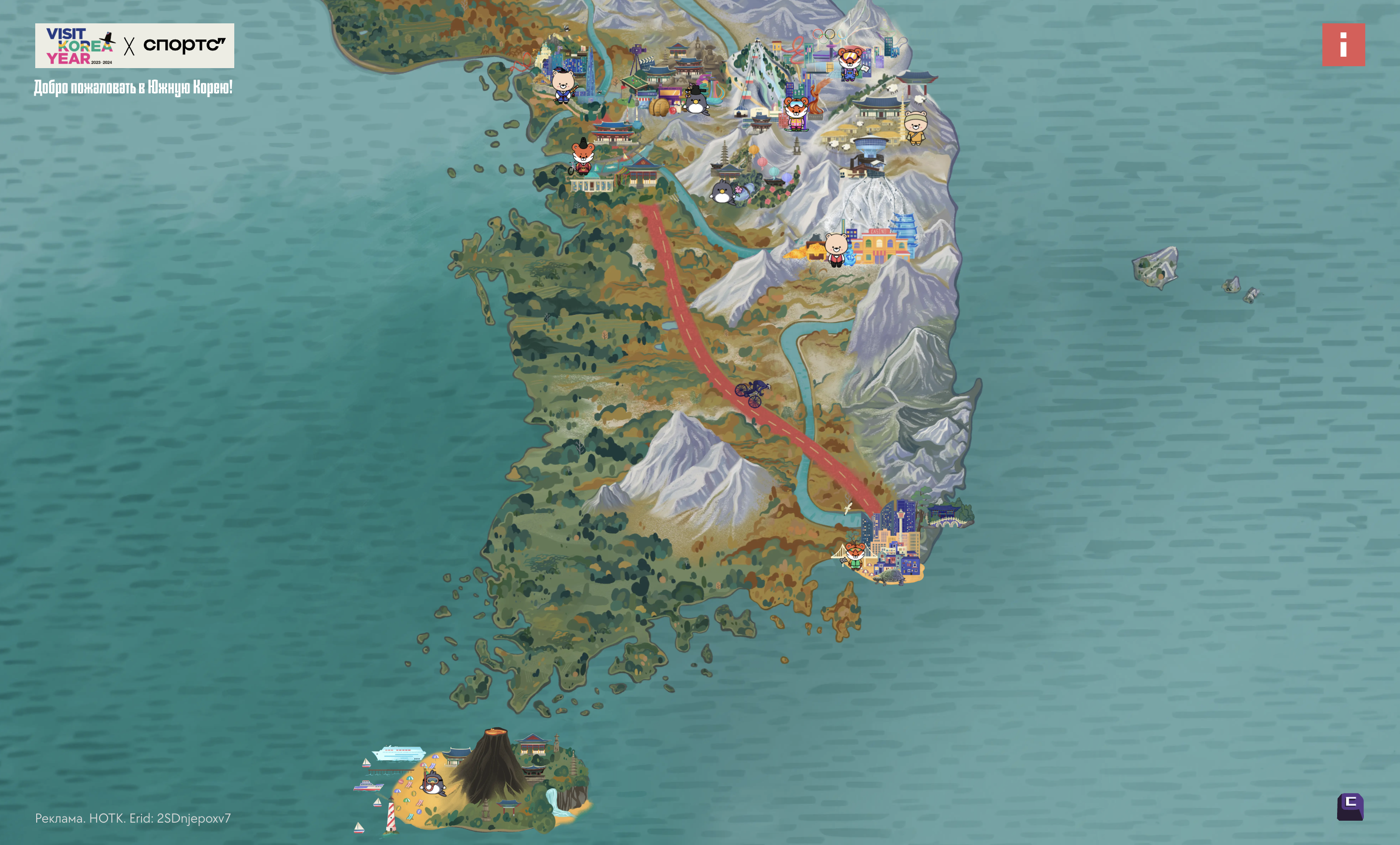 Иногда для более эффектной подачи контента лучше использовать нестандартную верстку — и такие проекты мы тоже очень любим реализовывать. Например, для Национальной Организации Туризма Южной Кореи мы сделали контентный спецпроект, где рассказали о десяти маршрутах для спортивного туризма по Южной Корее. Главная страница была выполнена в виде интерактивной карты страны, которую было интересно разглядывать.