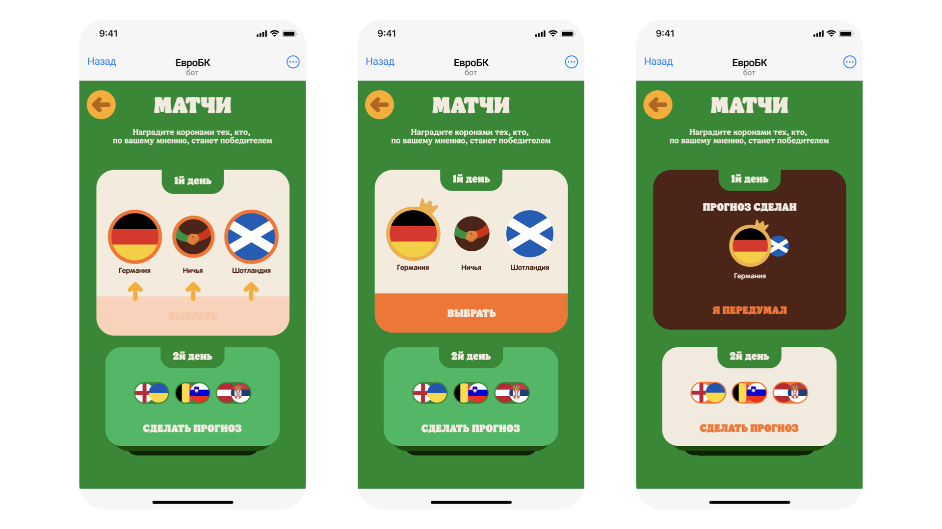 Например, под Евро-2024 мы сделали для Бургер Кинг телеграм мини-апп, внутри которого пользователи могли делать свои прогнозы на матчи, а за верно угаданный исход получать купоны на продукцию от Бургер Кинг. Для большего погружения аудитории механика проекта строилась на нарастании: с каждым новом этапом турнира увеличивалась ценность купонов. Вот так выглядел интерфейс приложения: