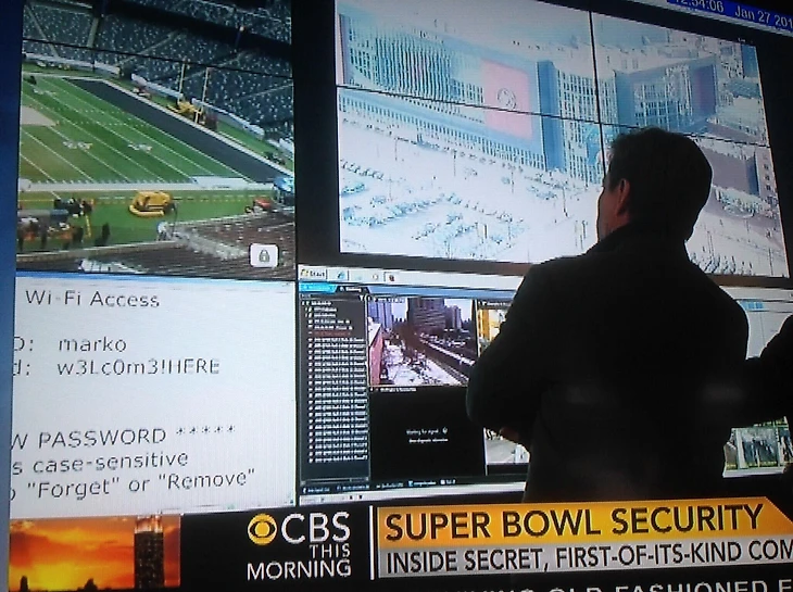 2.00. Хохма дня. Когда по национальному телевидению показывали штабную комнату секьюрити на стадионе «Метлайф», на экране у них висел логин и пароль от местного вай-фая. Таким образом, тайное стало о-о-очень явным.