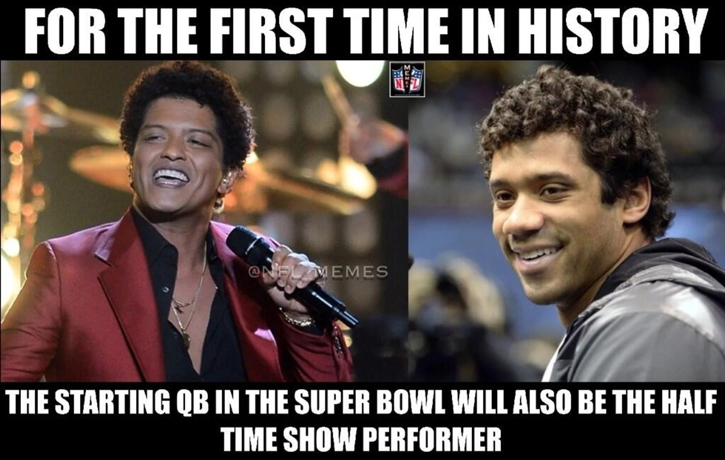 23.20. В перерыве матча планируется традиционное яркое Half-Time Show. Когда-то традицию грандиозных выступлений заложил Майкл Джексон. За последние годы на сцене побывали Black Eyed Peas, Мадонна и Бейонс. В этом году будет парень, которого зовут Бруно Марс, а поддерживать его будут ветераны фанк-рока Red Hot Chili Peppers. Главное, не перепутать Бруно Марса с квотербеком «Сиэтла» Расселлом Уилсоном, а то они похожи.