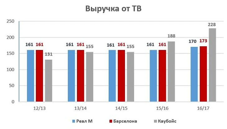 Интересно взглянуть выручку от ТВ-прав. Опять же, у всех трех команд сопоставимые показатели в течение последних 5 лет, но за счет нового соглашения «Каубойс» выходят вперед. Сумма в $228 миллионов — прогноз, основанный на оценке общей стоимости ТВ-прав в $7,3 миллиарда в год. Контракт НФЛ на телевещание рассчитан до конца 2022 года. К тому времени, возможно, «Барселона» и «Реал» догонят американцев по этому показателю за счет нового соглашения Ла Лиги с телекомпаниями и постоянно увеличивающегося дохода от Лиги чемпионов.