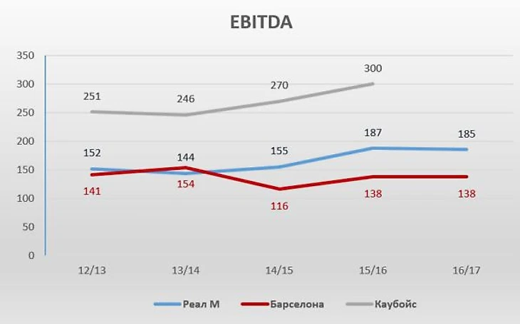 Помимо доходов, важно понять, какие у команд расходы. Сравнивать чистую прибыль клубов невозможно, потому что «Барселона» и «Реал» списывают амортизацию за трансферы игроков и недвижимость и платят налоги, в то время, как «Каубойс» не имеют амортизационных отчислений такого рода и не платят налогов как посредник (налоги платит владелец команды Джерри Джонс). Поэтому правильнее будет сравнить EBITDA команд (прибыль до уплаты процентов, налогов и амортизации).