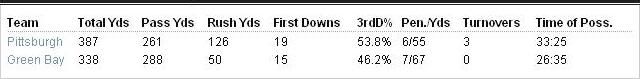 Бен Ротлисбергер славился своей сильной игрой в самых ответственных и важных матчах, и победы в двух Супер Боулах 2005 и 2008 являются самым ярким доказательством этому. Но в этот вечер всё шло не по сценарию Биг Бена. Ротлисбергер выглядел каким-то разобранным, но тем не менее ему почти удалось сделать камбэк. Менее чем за минуту до конца второй четверти Бен бросил первый тачдаун в матче на Хайнеса Уорда и команды ушли на большой перерыв при счете 10-21 в пользу "Пэкерс". После перерыва Рашад Менденхолл поддержал погоню за соперником, совершив тачдаун. Однако, Менденхоллу суждено было стать одним из антигероев этого матча, в результате столкновения с лайнбекером "Пэкерс" Клэем Мэтьюсом, Менденхолл выпустил мяч из рук и ещё один лайнбекер "Грин Бэй" Десмонд Бишоп подобрал фамбл. Это был один из ключевых моментов встречи.